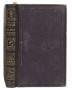 Dos personnalisé à quatre nerfs comportant quatre scènes différentes en rapport avec le thème du roman et les mentions « VERNE/CINQ SEMAINES/EN BALLON » puis, en pied, entre deux filets dorés, « BIBLIOTHÈQUE D'ÉDUCATION/et de/RÉCRÉATION ».