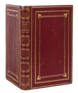 Octodecimo, full red panelled morocco with triple gilt fi llet and corner fl eurons on both covers. Spine with 5 raised bands and gilt compartments. “N” for Nadar at the foot of the spine. Gilt edges and inner dentelles. Marbled endpapers. Bookplate of Nadar (“Quand même”) and a later one of Edouard Balay. (Contemporary binding)