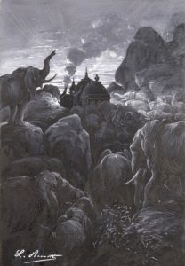 Undoubtedly one of the most magnificent of Benett's compositions, one could say worthy of Gustave Doré. The sombre mass of elephants (symbols of The
