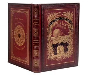 Un an après le projet avorté d'Hetzel de renouer avec une couverture personnalisée pour L'Île mystérieuse, cette très belle plaque est cédée pour cette luxueuse édition espagnole, imprimée et reliée à Paris.