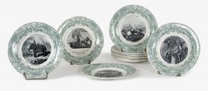 Complete series of 12 “talking” plates (diameter 20 cm), numbered from 1 to 12, in soft porcelain (kaolina) with green edge (rare colour) with 12 scenes, reproductions in black of illustrations from the novel Le Tour du Monde in 80 Days executed by de Neuville and L. Benett.