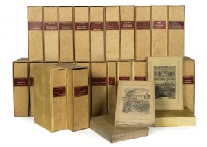 47 vols. large octavo, untrimmed in publisher's wrappers. Housed in 23 modern fake vellum wraparounds and slipcases. Red morocco title label with