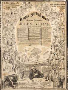 Hetzel Christmas 1889 poster called “Le Songe de Jules Verne” (Jules Verne's dream) with its original proof. Drawing by Lomis.