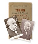 •Document 4 : Un volume broché. Auteur inconnu, compte-rendu de la Cour d'Appel de Paris vers 1922 sur l'affaire Turpin. Contient une brochure en complément. Turpin, artisan de la victoire demande justice (ses travaux, le canon à recul sur l'affut, la Mélinite, etc.) In-8 broché, couverture d'édition, 166 pp. Alb. Desableaux, impr.-Éditeur, sd (1922) (+ un fascicule de 16 pp. en complément annexé). Nombreuses photos et fac-similés.