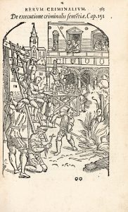Nouvelle édition latine du principal ouvrage de l'auteur. # L'ouvrage est particulièrement recherché pour son illustration, cinquante-six figures de crimes et de supplices gravées sur bois dans le texte. On trouve deux figures licencieuses aux pp. 372 et 376. # Destiné aux officiers de justice, ce manuel sur la pratique du droit criminel en Flandre offre un tableau des vices et des crimes, mais aussi des supplices auxquels on recourait pour les punir. Mis à l'index par Rome, l'ouvrage eut un énorme succès et connut de nombreuses éditions. # Exemplaire placé dans une reliure en vélin ancien.