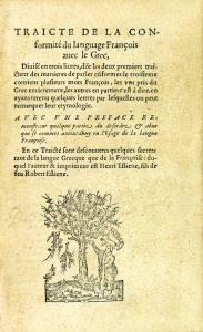 ESTIENNE (Henri). Traicté de la conformité du language françois avec le grec. S.l. [Genève], Henri Estienne, s.d. [1565]. In-8, veau granité, dos orné, tranches rouges (Reliure du XVIIIe siècle).