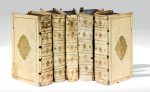 Huitième édition collective. # C'est l'une des éditions les plus complètes des œuvres de Ronsard qui aient paru au XVIe siècle. Seconde édition posthume des œuvres du prince des poètes, décédé sept ans plus tôt, elle contient, selon Prosper Blanchemain, quelques pièces de plus que l'édition de 1587, sur laquelle elle a pourtant été établie. # Trois portraits à pleine page, gravés sur bois, ornent les volumes : celui de Ronsard, répété six fois au cours de l'ouvrage, et ceux des rois Charles IX et Henri III. # « Cette édition, dont on trouve des tomes séparés, est extrêmement rare complète », écrit Tchemerzine. Brunet lui-même n'a pu en voir que des volumes séparés et Seymour de Ricci estime qu'on en connaît que trois ou quatre exemplaires complets. # Un des quelques rarissimes exemplaires complets remarquablement conservé dans sa première reliure en vélin doré, condition hautement désirable. # Très grand de marges, l'exemplaire présente encore des feuillets non coupés. # De la bibliothèque du comte Alfred Werlé (1908, II, n°105), avec ex-libris. Étiquette de la Librairie Pierre Berès. # Légère incision sur les bords du médaillon du quatrième tome. # Baudrier, IV, 351 – Tchemerzine, V, 484 – Brunet, IV, 1375.