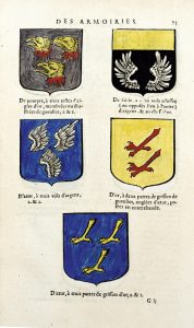 Réunion de trois traités d'héraldique publiés chez le même imprimeur. # Le Blason des armoiries est illustré de nombreux blasons dans le texte, gravés sur bois et au burin, et mis en couleurs. Jérôme de Bara était un peintre-verrier réfugié à Genève. Il a sans doute dessiné lui-même les blasons de son ouvrage, dont la première édition remonte à 1579. # Des bibliothèques La Bègne Villeneuve, Babut de Rosan, Rovery, avec ex-libris, et du collège de la Sorbonne, avec ancien cachet à la roue. # Saffroy, I, nos2068, 2074, 2123.
