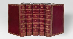 HELVÉTIUS (Claude-Adrien). Œuvres complètes. Paris, Servière, 1795. 5 volumes in-8, maroquin rouge à grain long, frises dorées, dos lisse orné, dentelle intérieure, doublure et gardes de papier bleu, tranches dorées (Reliure de l'époque).