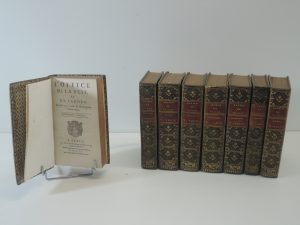 2 tomes par saison, 8 volumes parfaitement reliés en plein maroquin, tranches or, triple filets or sur les plats avec fleuron aux angles, titre sur 2 pièces, dos orné, roulette intérieur.