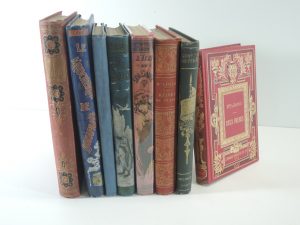 8 CARTONNAGES ÉDITEUR, toile bleue ou rouge, avec plaque dorée au recto.