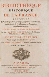 LELONG (R.P. Jacques, de l'Oratoire) : Bibliothèque historique de la France. Paris, Hérissant, 1768-1778 ;