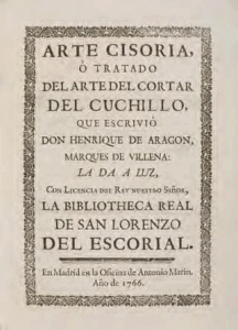 VILLENA (Henrique de Aragon, marquis de) : Arte Cisoria o tradado del arte del Cortar del Cuchillo. Madrid, en la officina de Antonio Marin, 1766 ;