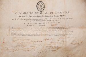 CERTIFICAT MAÇONNIQUE SUR VELIN, MARTINIQUE XVIIIe. Certificat décerné en 1790 au frère Jean Louis Moissonnier Capitaine de navire par la loge de St Jean constituée à l’Orient de Saint Pierre Isle Martinique, sous le titre « La Sincérité...
