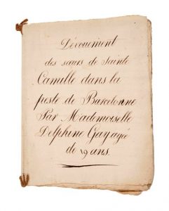 Delphine de GIRARDIN née GAY (1804-1855). Dévouement des sœurs de Sainte Camille dans la peste de Barcelonne par Mademoiselle Delphine Gay agée de 19 ans. Manuscrit contemporain (autographe ?) d’un poème de jeunesse de Delphine GAY présenté...