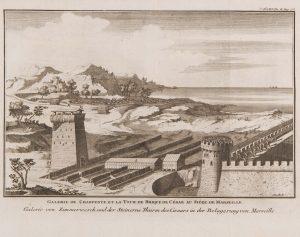 2 GRAVURES DU SIÈGE DE MARSEILLE. par César, XVIIe Galerie de charpente et la tour de Brique de César au siège de Marseille.