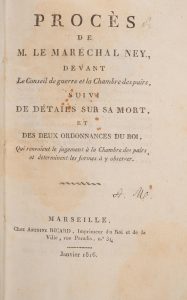 HISTOIRE] Procès de M.Le Maréchal Ney, devant le Conseil de guerre et la Chambre des pairs. Suivi de détails sur sa mort et des deux ordonnances du Roi (…) Marseille, Chez Antoine Ricard, janvier 1816.