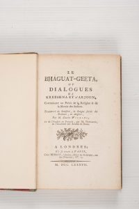[WILKINS et PARRAUD Trad.]. Le Bhaguat-Geeta, ou dialogues de Kreeshna et d’Arjoon contenant un Précis de la Religion & de la Morale des Indiens. Traduit du sanskrit, la Langue Sacrée des Brahmes, en anglois […] et de l’Anglois en François...