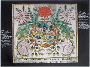 18e s. AQUARELLE ORIGINALE, +/- 27 x 29 cm, sur PEAU DE VÉLIN, légendée en français sous le champ cerné d'un large filet doré (lég. us. ou salissures sur les bords surtout). Posée sur papier noir avec commentaires mss modernes en français ou néerlandais, sous vitre. Belle grande composition. Thème central, cerné de volutes dorées, avec personnages, animaux, ville ou maison, coeurs ardents plantés dans le paysage arboré, le tout inséré dans de grandes compositions florales.