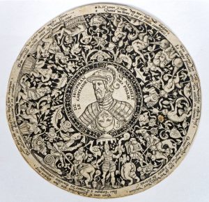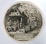 [c. 1600]. Eaux-fortes, format moyen, papier vergé, 3 signées ou monogrammées, titrées et légendées en latin (médaillons rognés). (1). "De hopman va[n] narheit. [Estampe satirique figurant le portrait du duc d'Albe]". Diam. 12 cm (1 point de rouss.). # Hollstein 179.-- (2). "L'âge d'or". Diam. 15,5 cm (2 déchirures sans pertes renforcées au verso) # Hollstein 14.-- (3). "Enoch placuit deo, et translatus est [...]". Diam. 9 cm (1 point de rouss., 1 déchirure sans perte renforcée au verso). Légende inversée.-- (4). "Forma Vicorum, Aedificiorum Tuguriorumque in India". Illustration gravée, cuv. 14,5 x 18 cm, sur page de texte (faible moisissure).