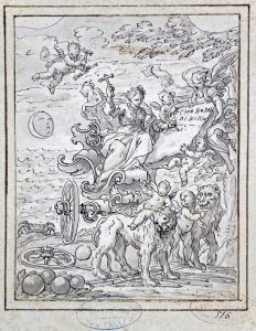 [c. 1700]. DESSIN ORIGINAL, plume et lavis à l'encre de Chine, 19 x 14,5 cm, papier vergé cerné d'un trait bistre, collé en plein sur f. de support (qqs. faibles rouss., 2 cachets illisibles dans la marge inf. du f. de support empiétant lég. sur le dessin, faible rouss. sur le f. de support). Sujet énigmatique (projet de frontispice?) avec le personnage central assis, sur un char situé sur une plage, gravant un texte sur une tablette monumentale tenue par des anges. Au sol, des traces de bataille (boules de canon, lances et roue).