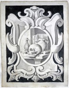 Vanité avec crâne, pichet, sablier et manuscrits cerné d'un cartouche baroque sur fond noir.