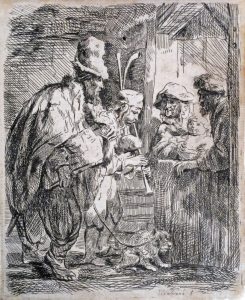 [ 1635]. Eau-forte, cuv. 13,7 x 11,5 cm, papier vergé, signée en bas, fixée par les coins dans passe-partout (rognée en deca de la cuv., 2 déchirures avec pet. manques au coin infér. dr., 2 bords lég. brunis). Variante du sujet bien connu.