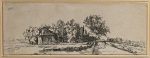 JOINT : Paysage avec grange à foin, ferme, grand arbre et palissade. 1659. E.-f., TC 7,7 x 20,3 cm, papier vergé teinté, datée en haut à dr., fixée sous passe-partout (pet. perforation en haut à g.). Intéressant travail anonyme mais entièrement dans le style et dans les dimensions des paysages en oblong de Rembrandt.