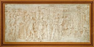 [ 17e siècle]. DESSIN ORIGINAL, crayon sanguine et mine de plomb, 19 x 42 cm, fin papier vergé filigrané, fixé par les bords sup. sur f. de support, attribution erronée sur le f. de support (trace d'une pliure verticale au centre, 6 anciennes déchirures sur les bords doublées de papier au verso dont une sur 15 cm en haut à g., pet. manque au coin inf. dr. comblé au verso, qqs salissures ou taches principalement sur les bords, f. de support lég. détérioré).