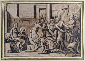 DESSIN ORIGINAL, pinceau et lavis à l'encre bistre, rehauts de blanc, papier vergé, 16,8 x 24,5 cm, monogrammé "F.P." en bas à g., collé en plein sur carton de support (déchirure sans perte en bas à dr.). Dessin aux dimensions exactes de la gravure sur bois en chiaroscuro par Nicolo Vicentino (c. 1510-?) donnée par Andrea Andreani (c. 1558-1629) d'après le dessin du Parmigianino conservé au Louvre. Le premier état de cette planche porte le monogramme "F.P." comme notre dessin, le second le monogramme d'Andreani et la date 1605. Attribution erronée à Frans Francken (1546-1616) sur le carton de support.