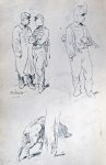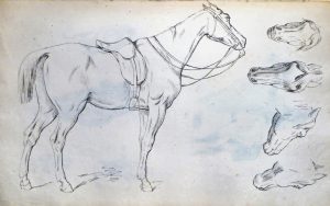Cahier d'études de chevaux, de militaires et de paysanes ou de femmes en costumes folkloriques, milieu du 19e siècle.
