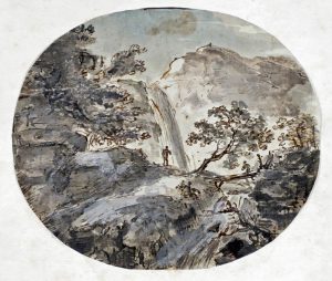 [Suiveur de MILLET, Jean-François (1814-1875)].- Paysage montagneux avec promeneurs devant une chute d'eau.