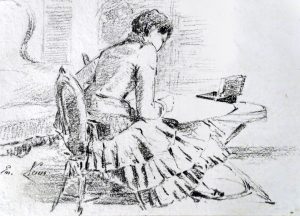 CLAUS, Émile (1849-1924).- Femme vue de dos assise à sa table de dessin.