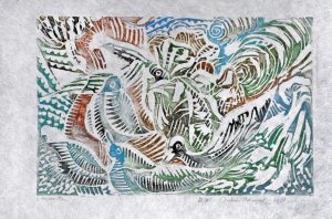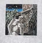 1951. BOIS, TIRAGE EN COULEURS, 3 bois de 10 x 10, 5 cm ("Soleil couchant", "L'oubli" et "Objets et Paysage") et 2 bois de 19,5 x 12,5 cm ("Mouettes" et "Les esprits du Feu"), sur GRANDES FEUILLES DE FIN JAPON (38 x 26 cm), signés avec justif. diverses à la mine de graphite.