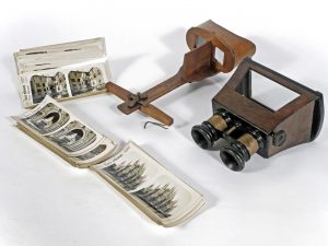 +/- 550 cartes stéréoscopiques en noir figurant des villes (italiennes pour la grande majorité) + 2 visionneuses.