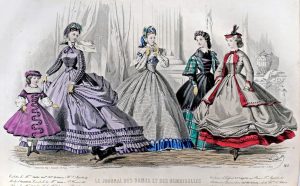 Bruxelles, Bruylant-Christophe et Cie, de 1830 à 1895. 45 vol. : 30 vol. in-f° et 15 vol. in-8° (qqs pl. ou pp. déreliées, cahier détaché au vol. 1855-1856, trou dans la p. 309 de l'année 1852, qqs rouss., pet. défauts et pet. us.). Rel. de l'époque : demi-cuir ou demi-chagrin noir à petits coins, plats de papier marbré, dos lisses titrés dorés avec filets et roul. dorés ou filets à froid, qqs tr. jaspées ou de couleur (us. ou défauts, qqs plats frottés, qqs mors en partie fendus, un dos manquant, cuir de qqs dos fendu, rel. montée à l'envers au vol. des années 1870-1871, qqs coupes lég. émoussées). Années 1830, 1848, 1849 et successives à partir de l'année 1851 (incomplet toutefois des années 1882-1883, 1885-1886 et de 1890 à 1892). Illustré de nombreux in texto et de nombreuses gravures hors texte sur simples, doubles pages ou dépliantes, dont 847 rehaussées à l'aquarelle (parmi lesquelles 147 figurent des patrons), présentant toujours le nom de l'entreprise créatrice. Le titre de la revue variera au fil des années et présentera à partir de 1854 un texte identique à celui du "Moniteur de la mode". Elle sera réunie en 1862 à la "Brodeuse illustrée".