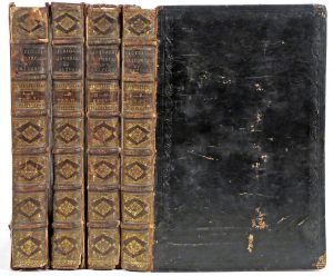 Rotterdam, Reinier Leers, 1797. 4 vol. in-f° (n.c., vol. lég. brunis, rouss., piqûres, qqs notes mss dans les marges et soulignements modernes, mouill. marg. dans 3 vol., rares déch. ou perforation marg. au vol. II). Rel. de l'époque : plein veau, plats de cuir noir cernés de filets et d'une roul. à froid, dos en veau fleuronné doré à nerfs, tr. jaspées de rouge (mors en partie fendus et frottés, manques ou coiffes absentes, plats recouverts de cuir noir au 19e s., éraflures, plats en partie frottés, coins et coupes émoussés, qqs coins à nu, note au marqueur rouge sur la garde sup. du vol. I). Recueil de biographies de personnages ayant marqué la vie politique, religieuse et philosophique, conçu à l'origine en réplique au "Dictionnaire historique et critique" de Moreri. Le "Dictionaire" publié pour la première fois en 2 vol. in-f° à Rotterdam en 1697 connut 8 éditions françaises en l'espace de cinquante ans et fut traduit en anglais et en allemand. Grande vignette par G. vander Gouwen sur les titres.
