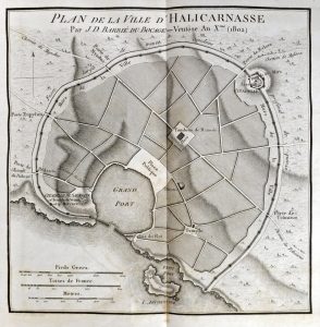 Paris, Imprimerie de Charles Pougens. Genet, libraire, An XI. - 1802. In-4° : [4]-196-[4] pp.; 16 h.-t. (rouss.). Rel. de l'époque : demi-veau, plats de papier vert foncé à impression grains longs, dos fleuronné doré à nerfs, tr. marbrées assorties aux gardes (coins fort émoussés, mors fendillés à fendus, manque important dans le bas du dos, coiffes absentes, coups sur les coupes). Incomplet des tomes I, III et de l'Atlas, sinon tome complet des planches dépliantes (qqs-unes fort grandes) figurant des ordres de bataille, des villes (Halicarnasse, Alexandrie), médailles, machines de guerre, armes, "guerriers en action". Avec la "Carte des expéditions d'Alexandre" non signalée à l'"Avis au relieur", réservée aux ex. in-4°.