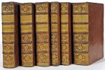 Paris, Le Mercier, Lottin, Josse fils, Briasson, 1725. 5 tomes en 6 vol. in-4° (texte n.c.); 19 h.-t. (complet des h.-t. dont les 1ers sont tachés de rouge à cause de la mise en couleurs des tranches par le relieur, mouill. marg. +/- forte au tome I ayant entraîné qqs moisissures en tête du vol., qqs plis en tête de qqs ff. du t. II, notes mss correctives de l'époque au vol. IV pp. 301 et 361). Rel. de l'époque : plein veau, plats cernés d'un filet à froid, dos fleuronnés dorés à nerfs, tr. rouges (plats +/- frottés, mouill. au t. I). ÉDITION ORIGINALE DE CETTE TRADUCTION par le jésuite Joseph-Nicolas Charenton de cette chronique depuis les temps bibliques jusqu'à la fin du XVIe siècle illustrée de 4 cartes dépliantes et 16 pl. (sur 15 ff.) numismatiques. L'originale en latin parut en 1592, en espagnol en 1601 et plusieurs traductions en français dès 1694.