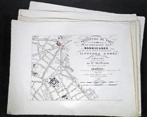 Eaux-fortes principalement, qqs ff. en typographie, formats moyen à grand (qqs pliures ou pet. déch. avec ou sans pet. manques, qqs ff. très faiblement défraîchis). Révolution de 1789 : 8 documents dont les testaments de Louis XVI et de Marie-Antoinette.-- MOTTE, Charles.- Révolution de Paris. Plan figuratif des barricades ainsi que des positions et mouvements des citoyens armés et des troupes pendant les journées des 27, 28 et 29 juillet. P., l'Auteur, 1830. 12 feuilles dont 3 de texte gravé. RARE.-- "Les 3 grandes journées de Paris, 27, 28 et 29 Juillet 1830". Épinal, Pellerin, s.d. Bois rehaussé à l'aquarelle.-- Plan de la Ville de Paris [...]. Gravé par Charmont d'après Hocquart. P., J. Moronval, [1827] (délimitations au crayon rouge ou bleu).-- L'Affaire de la machine infernale de Frieschi et Papin, 2 lithographies.