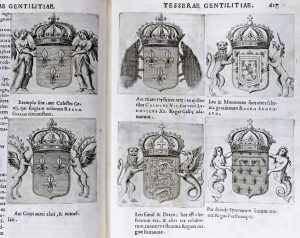 Romae, typis hered. Francisci Corbelleti, 1638. In-f° : titre gravé-[10]-[30 (sur 34)] pp.; 2 h.-t. (incomplet du vocabulaire latin-italien, déch., perforations ou galeries de vers marg., la majorité restaurée, grande déch. sans manque p. 265, titre gravé doublé et remonté, rouss., parfois nombreuses, qqs pp. lég. brunies, claires mouill. marg., trace d'1 note ms. à la p. 215). Rel. du 19e s. : demi-parchemin à coins, plats de papier marbré, dos lisse fleuronné doré (plats frottés, coupes à nu). ÉDITION ORIGINALE de ce traité d'héraldique "fort rare et d'un grand intérêt pour l'art du blason" (cfr Saffroy) dans lequel Pietrasanta utilisa pour la première fois le système des hachures pour représenter les émaux et les métaux. Il est illustré d'1 titre allégorique gravé par Johann Friedrich Greuter d'après Giovanni Francesco Romanelli, du portrait en médaillon du dédicataire Thadeo Barberini (1603-1647) par Michel Natalis, d'1 hors-texte aux armoiries de la famille Barberini et d'approximativement 3.000 blasons in texto (sauf 1 pleine page) gravés sur cuivre (sauf quelques-uns sur bois). Ceux-ci sont classés par types d'armes ou d'armoiries (heaumes, colliers d'ordres, couronnes...). Pietrasanta (1590-1647), jésuite, fut professeur d'humanités et de philosophie à Fermo (Marches), nonce apostolique à Cologne et recteur du collège de Lorette.