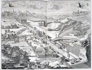's Graavenhage, Pieter De Hondt, 1734. 2 vol. in-f° : [44 incl. frontisp.]-348-[23], [4]-360-[24] pp.; 23 pl. (enkele miniscule vl. passim). Eigentijdse band : volperkament, platten met dubbel lijnenkader en een groot centraal ornament in blindstempeling, titel in hs op rug met ribben (scharnieren gesplit, schutbl. gelost, platten licht gewreven en gevlekt). EERSTE UITGAVE van deze geschiedenis van Holland van de prehistorie tot de 11de eeuw door de penningkundige Gerard van Loon (Delft 1683-1758 Leiden), geïllustreerd met een frontispice door François Morellon de La Cave, 13 kaarten (o.m. Gallië, Karolingische Rijk, Nederland), 10 koperplaten door o.a. Folkema en van Bleyswyck (kledij van de Bataviërs, heirbaan met Romeinse villa's en monumenten, ...) en c. 90 gravures in texto (voornamelijk munten). De tekst is voorzien van een kritisch apparaat met citaten uit antiek en middeleeuws bronnenmateriaal en bevat tevens 22 genealogische tafels.