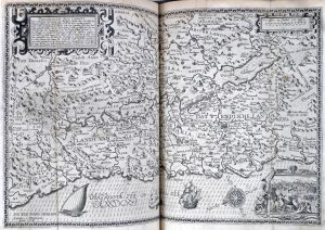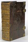 Amsterdam, Jan Evertsz. Cloppenburch, 1614 [in fine : Amsterdam, Ghedruckt by Nicolaes Biestkens, 1614]. 4 delen in-f° : [20 incl. gegraveerde titel]-274, 120, 81-[1], 143-[1] ff.; 3 uitslaande kaarten (licht gebruind, bleke watervlekken bovenaan het volume, titel kort afgesneden en met gerafelde randen, enkele kleine wormgaten in de laatste bladen). Eigentijdse band : donker kalfsleder over dikke houten platten, blindstempeling van lijnenkader en centraal medaillon, messing hoekstukken en sluitingen (rug met ribben vernieuwd, 2 ontbrekende hoekstukken). Belangrijke Protestantse bijbel met apocriefe evangeliën. Geïllustreerd met 3 (van 6) kaarten door Johannes van Deutecum naar Plancius (c. 1595) : de Woestijnreis, de "Peregrinatie Jesu Christi" en de "Peregrinatie der Apostelen" door het Middellandse Zeegebied.
