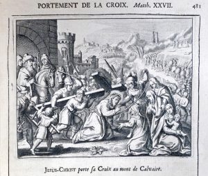 Paris, Christophe David, 1723. In-f° : [16]-548-[2] pp. (ex. lég. bruni, qqs pp. un peu plus fortement, rares piqûres éparses). Rel. de l'époque : plein veau marbré, dos fleuronné doré à nerfs, tr. marbrées (rel. frottée par endroits, pet. manque à la coiffe sup., coupes inf. émoussées, coins à nu). Une des nombreuses éditions (éd. orig. : 1670) de cet ouvrage attribué à Lemaistre de Sacy, mais qui serait plutôt de Nicolas Fontaine. Illustrée de 267 eaux-fortes in texto, 2 bandeaux (armorié et historié), 2 lettrines (ornementée et historiée) et 1 vignette sur le titre. La vie des patriarches et Saints Pères de l'Église, considérés comme parfaits modèles de vertu, y est développée. "Abrégé de la chronologie sainte" in fine.