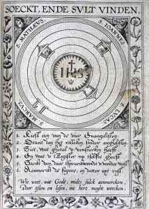T' Antwerpen, inde Plantijnsche Druckerije by Jan Moerentorf, 1603 [- 1602]. 2 delen in 1 vol. in-4° : gegrav. titel-[16]-372-[6], 38-[10] pp.; 101 pl. (titelblad afgesneden en opgekleefd, gebruind en gevlekt, enkele scheurtjes en lacunes). Moderne band : perkament met recuperatie van oude fragmenten, rug met ribben en titelschild (platten gebogen). EERSTE NEDERLANDSTALIGE UITGAVE van dit merkwaardig emblemenboek door de Vlaamse jezuïet David (1546-1613) waarin rooms-katholieke leerstellingen worden behandeld in 100 hoofdstukken en op allegorische wijze worden uitgebeeld in evenveel koperplaten gegraveerd door Joannes of Theodoor Galle. Elk van deze genummerde prenten, met een macabere en/of groteske inslag, heeft een Latijnse titel en gaat vergezeld van een drievoudig distichon in het Latijn, Nederlands en Frans. De titel van het 2de deel, de "Rolle der Deugtsaemheyt ", is versierd met een grote en bijzondere voorstelling van de Kruisdraging van Christus die door 10 schilders elk vanuit een ander standpunt wordt geportretteerd en bevat de zeldzame plaat met BEWEGENDE ZOEKSCHIJF ter concordantie der citaten uit de evangeliën betreffende de 100 behandelde spreekwoorden.