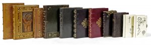 Volumes avec, en noir ou en couleurs, texte cerné d'un filet ou d'encadrements (ornementés ou historiés) et illustrés soit d'un frontispice et/ou de quelques planches : Missel romain. Limoges, s.d., in-12°, plein cuir, plat sup. avec plaque en relief d'un cuir plus foncé (Christ en croix) cernée de filets avec fleurons dorés, plat inf. avec encart de veau moucheté cerné d'un double filet doré, dos fleuronné doré à nerfs. Ex-libris O. Balleriaux.-- Missel romain. Dijon, s.d., in-12°, plein maroq. noir, plat sup. avec monogramme "J M", dos à nerfs, doublures et gardes de soie moirée dorée décorée en noir, roul. dorées sur les remplis, tr. dorées, sous coffret. Enrichi (?) d'1 reprod. photogr.; étiq. librairie E. Dortet.-- Paroissien romain [...]. Limoges, in-32°, plein maroq. brun (découpe ondulée des plats), plats cernés d'une roul. et d'un filet dorés, plat sup. décoré doré sur le côté droit, dos fleuronné doré à nerfs, roul. dorées sur les remplis, doublures et gardes de papier moiré fleurdelisé, tr. dorées.-- Étrenne spirituelles ou Recueil de pieux exercices. Turnhout, (impr. 1864), in-32°, plein chagrin avec décor à froid, dos lisse, fermoir.-- Paroissien romain [...]. Tournai, 1888, in-12°, plein cuir bordeaux, plat sup. avec monogramme "IHS" doré, plat inf. avec monogramme couronné doré, dos fleuronné doré à nerfs, tr. dorées, doublures et gardes de papier mauve avec motifs dorés répétés. Ex-dono de l'archevêque de Malines Pierre-Lambert Goossens à sa nièce.-- Paroissien romain [...]. Tournai, 1888, in-12°, plein maroq. brun, plat sup. avec monogrammes dorés "IHS" et "A B", plat inf. avec monogramme couronné doré ident. à celui du vol. précédent, dos fleuronné doré à nerfs, doublures et gardes de papier bleu avec semé fleurdelisé doré, tr. dorées, sous coffret.-- Missel des serviteurs de Marie. P.; Lille, (impr. 1891), in-8°, plein maroq. brun, plat sup. avec décor doré et monogramme "S D", plat inf. cerné d'un double filet doré, dos fleuronné doré à nerfs, roul. dorées sur les remplis, doublure et gardes de papier avec semé fleurdelisé doré, tr. dorées.-- Sursum corda. Recueil de prières usuelles. Anvers, (impr. 1899), in-32°, plein ivoire, décorations argentées sur le plat sup., fermoir.-- Missel du Sacré-Coeur. Braine-le-Comte, (impr. 1901), in-8°, plein veau, plat sup. avec plusieurs plaques à froid et une au centre figurant Jésus trônant, plat inf. avec médaillon à froid, dos à nerfs, roul. dorées sur les remplis, doublures et gardes de soie moirée beige, sous coffret.-- [Thomas à KEMPIS].- Imitation de Jésus-Christ. Traduction nouvelle avec des réflexions à la fin de chaque chapitre par l'abbé F. de Lamennais [...]. Dijon, (impr. 1903), in-12°, plein veau décoré dans le style "Art nouveau" en doré et à froid, dos lisse, roul. dorées sur les remplis, doublures et gardes de papier moiré blanc avec décoration florale dorée, tr. dorées, sous coffret. Étiq. L. Baldauf.-- FIÉVET, abbé.- Nouveau paroissien romain. Kevelaer, (impr. 1905), in-32°, plein ivoire, plat sup. avec décorations argentées, fermoir.