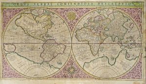 1587. Copper engraving, TC 28,7 x 52 cm + margins, colored (vertical fold, small tears on the edges, browned, paper strokes pasted on the verso). MERCATOR'S GREAT WORLD MAP of 1569 condensed into a double hemispherical form by his son Rumoldus. The map was published in the french edition of Mercator 's atlas in 1609 and in 1619.