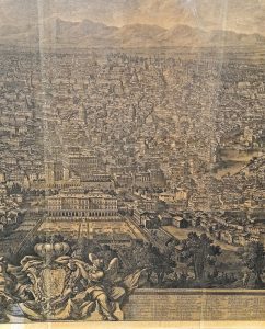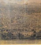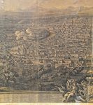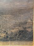 [ Roma], G. Vasi, [ 1829]. Gravure sur cuivre, TC 102 x 261 cm + marges, 12 feuilles assemblées (collée en plein sur toile, ancien vernis jauni, traits et 4 perforations peu grave dans le champ). Sous cadre de bois peint en noir. Retirage de ce célèbre panorama de Rome (cfr. date sur le chapiteau en bas à dr. du titre; 1er tirage : 1765) depuis le Janicule, colline de la rive droite du Tibre. Figure toute la ville, de la basilique Saint-Pierre jusqu'à la Fontana dell'Acqua Paola avec le Panthéon au centre. Avec dédicace et armoiries de Charles III. Autoportrait de Vasi (1710-1782) dans le coin inférieur gauche et liste de 390 sites et monuments, numérotés comme dans son guide "Itinerario istruttivo diviso in otto giornate per ritrovare con facilita tutte le antiche e moderne magnificenze di Roma".