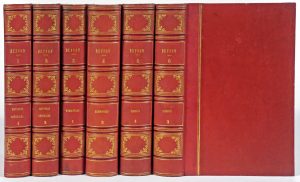 Paris, au Bureau des publications illustrées (imprimerie de H. Fournier [- Claye et Taillefer]), 1842 [- 1848]. 6 vol. gr. in-8°; 118 h.-t., la majorité protégé de serpentes (rouss., parfois nombreuses, vol. en partie brunis, qqs pl. lég. jaunies, rares perforations marg.). Rel. de l'époque : demi-chagrin rouge, plats de papier chagriné rouge cerné sur le côté gauche de 2 filets dorés, dos fleuronnés dorés à nerfs, tr. jaspées de bleu (qqs pet. us.). Illustré du portrait du naturaliste en frontispice du vol. I, de 5 cartes aux limites rehaussées et de 112 planches rehaussées, certaines partiellement gommées, d'après/par Édouard Traviès, Janet Lang, Ambroise Tardieu, etc. Volumes consacrés aux matières générales (2 vol. : théorie de la terre, époques de la nature, explication de la carte géographique, histoire des minéraux), mammifères (2 vol.) et aux oiseaux (2 vol.).
