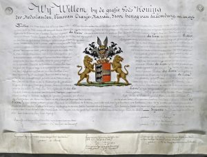 Copie conforme des lettres patentes concédant le titre d'écuyer avec les armoiries à Jean Henri Sigismond de Liem, ancien lieutenant-colonel, accordées par Guillaume Ier d'Orange-Nassau.